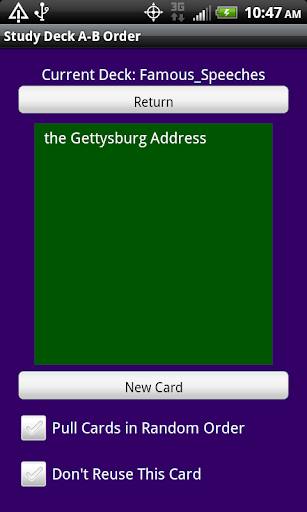 With this app you can make multiple decks, delete them, add or delete cards in new or old decks, study decks in sequential or random order, and set cards aside as you study a deck. All your creations and changes are saved, and are not lost when you turn off your cell phone.