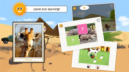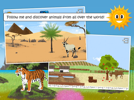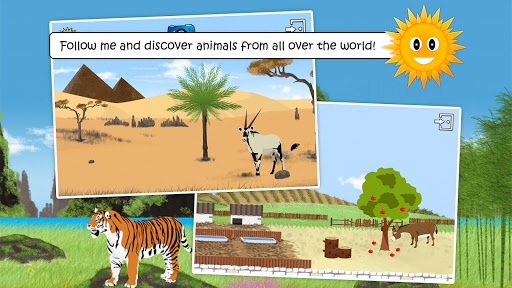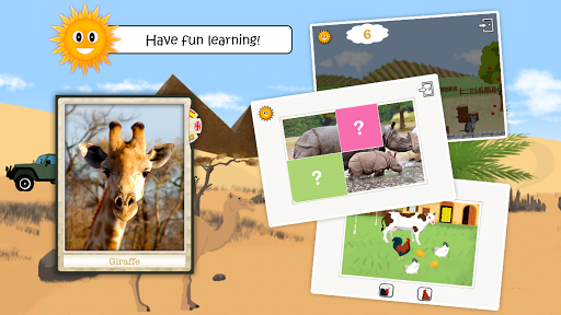 - "Where is ...": only one animal is present in the scenery: the child has to scroll to find it. A "bobble head" type card appears.