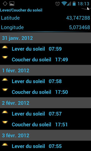 The apps permit as well to know sunrise and sunset times from your localisation.