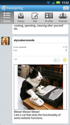 With the official Formspring Android App, you can respond to friends on the go, ask questions and post to Twitter and Facebook, and share photos to get your friends' responses to just about anything from anywhere.