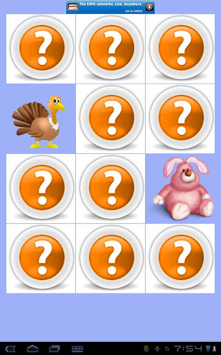 Tab on 2 cards to turn the cards. If both cards are the same, those cards will be removed. If they are the different, remember what is on the card so you can try again. Repeat above until you match all cards.