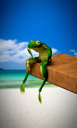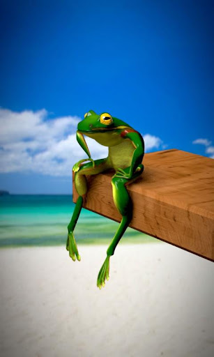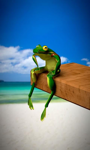可愛的活壁紙與綠色的青蛙,正享受著坐在旁邊一杯雞尾酒的沙灘上和聽音樂。青蛙戴著耳機和改變音樂的節奏中。一個精彩的應用程式,來減輕你的頭腦。