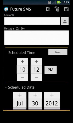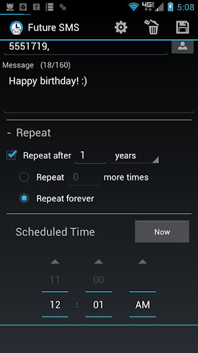 Future SMS features a highly customizable message scheduling screen, allowing you to draft messages on your own terms. By using the repetition feature, you can make sure you're always be the first person to acknowledge a birthday, anniversary, or recurring special event!