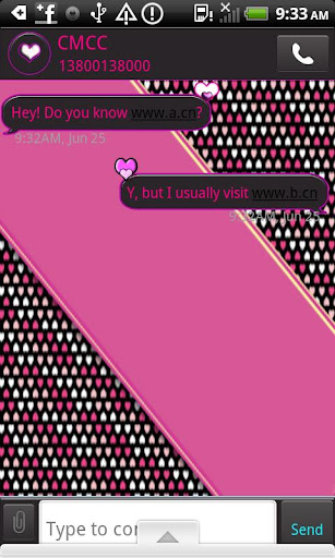 This go sms theme has a black background with white and pink hearts. The hot pink writing really stands out on the black chat bubbles.