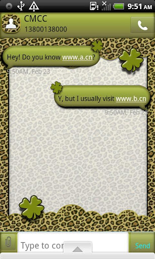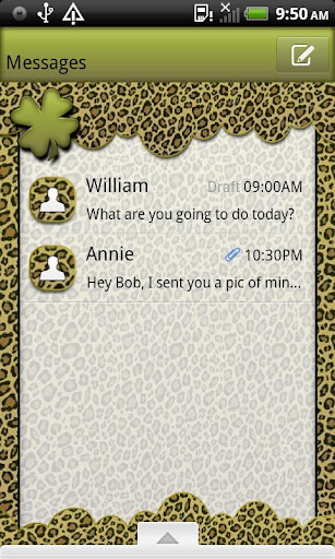 This shamrock cheetah go sms theme is one of my most popular themes. The background has a beautiful cheetah print and the chat bubbles have a green shamrock on them, there is also a four leaf clover in the in box. I Love it. Hope you will too!
