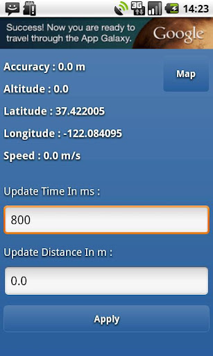 You can set the update time and distance, then check your altitude, latitude, longitude and speed with the accuracy of your device.