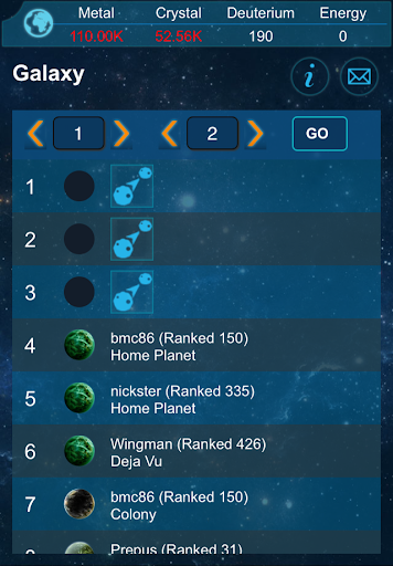 Players start out with a single undeveloped world and attempt to build a huge empire in the universe. Along the way to their empire, players can form alliances with other players, research technologies to improve space ships, and perform various missions. Alliances are similar to guilds and serve many functions such offering members protection, enabling free trade among members, and consolidating forces for attacks. Although the game is text-based, Galactic Empires still looks good and has more action than most other games in the genre.