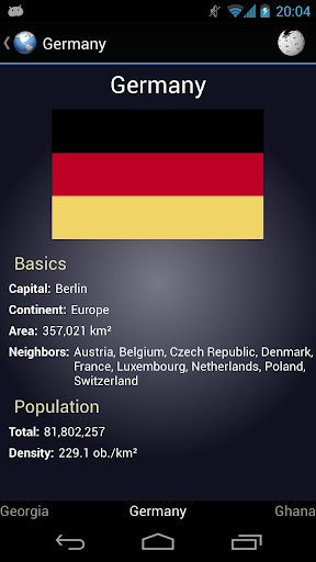 In the learning mode, you can explore information about the country such as flag, capital, area, population, etc.