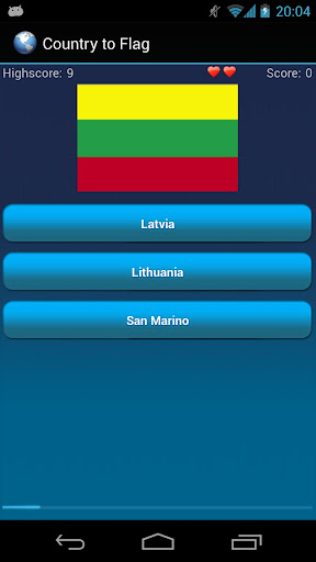 Testing mode includes five quizzes: country to flag, flag to country, capital to country, country to capital and border countries.