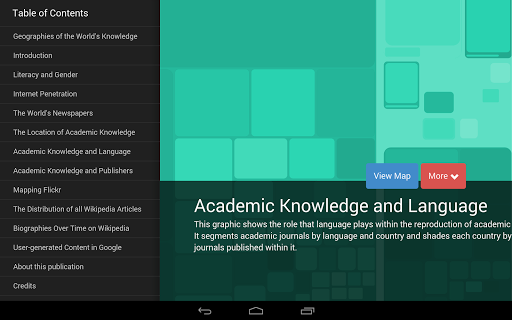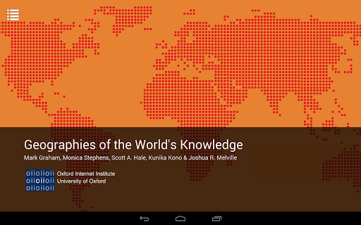 Who owns the world's knowledge? Who produces it? Who is able to consume it? Has the Internet democratised geographies of information? This free interactive book containing accessible, informative and beautiful maps and graphics illustrates geographies of knowledge in our Internet Age. It visualises and explores contemporary patterns of commercially produced and peer-produced knowledge. The intriguing results should be seen by anyone interested in better understanding the global flows of knowledge.