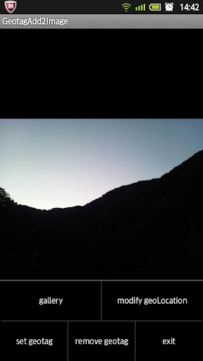 From the main screen, press the Menu key to display the menu. Tap the 'set geotag' button, may be created a copy registered with the picture file in the Exif information as geo-location of the cross on the map. Copying file to the same folder as the original image at the top of the original image file name read-ing "GEOADD_" will be printed and attached file name.