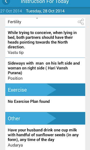 WishBaby gives you instructions on what to eat, what positions to have sex in, yoga positions to practice and Ayurvedic supplements to have every single day. Based on the day of the month, it gives you how much and when to do specific things that will help you prepare your body for a healthy pregnancy.