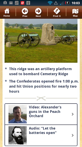 Click on our "virtual signs" to access a wealth of information related to the very location where you are standing. Onboard historian videos, audio accounts from soldiers and civilians, photos, facts, and more are just a click away. Never has so much information been made available in such a portable device!
