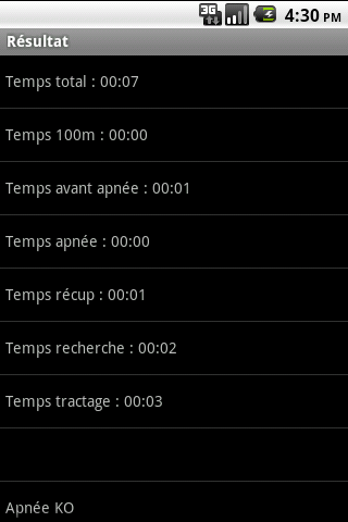 Une fois l'épreuve terminé, une vue synthétique affiche le temps total ainsi que les temps intermédiaires.