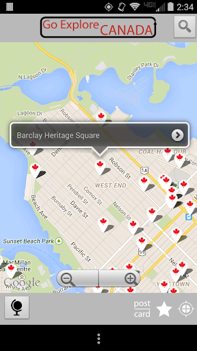 go Explore Canada uses the familiar Google map locating you as a pulsating blue dot (GPS activated) surrounded by color-coded pins (Points of Interest)