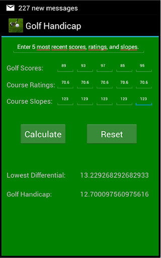 Golf Handicap Calculator calculates lowest differential and golf handicap based on 5 most golf scores with the associated course ratings and course slopes.