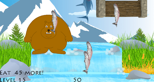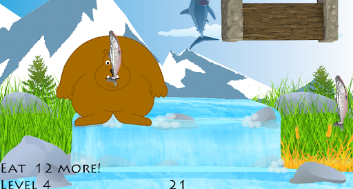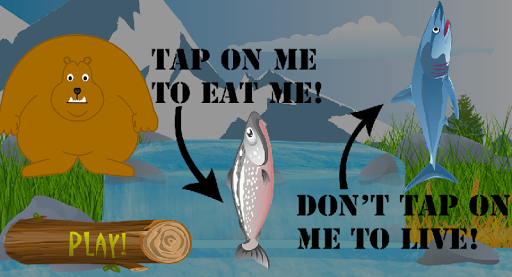 Grizzly Grub, an addictively fun and silly game that anyone can play! You are Clawson, a very hungry bear ready to eat some fish. Your goal is to tap on the salmon that jump out of the river but be careful to avoid the sharks that also swim these waters. Eat the needed number of salmon in your time limit to move onto the next level. Eat 3 sharks or run out of time and you lose. With addicting and increasingly difficult levels this is a must have game!
