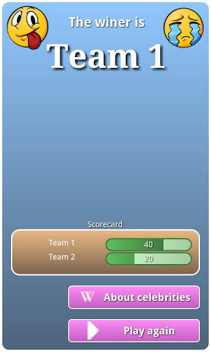 Guess Celebrity (also known as Celebrities, Time over, Hurry up or Lunchbox) is a party game where teams play against each other to guess as many celebrity names as possible before time runs out. This is the perfect game to play with friends or family on a party, outdoor or saturday night. The game can be played offline anywhere.