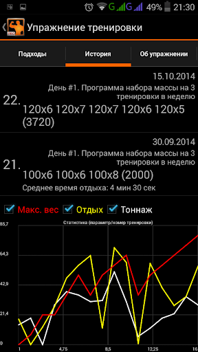 * планировать подходы, вес и повторения, используя результаты предыдущих тренировок (они будут представлены в виде удобных списков и графиков)