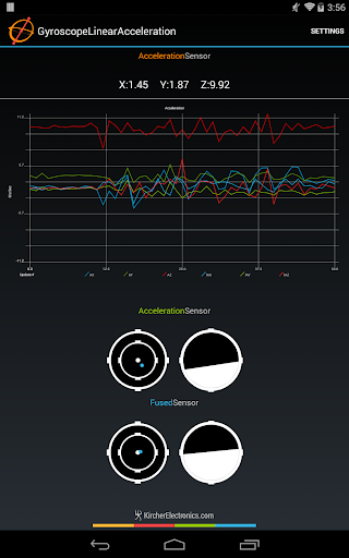 Gyro Linear Acceleration will plot the output of the sensor fusion in real-time and will also log the data to an external .CSV file that can be viewed at a later time on any spreadsheet application.