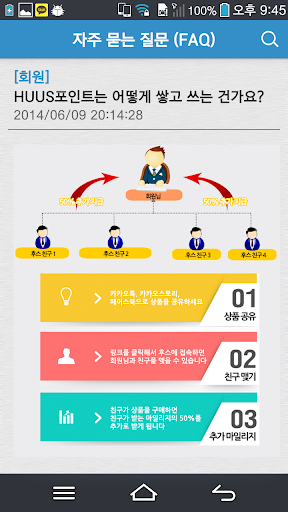 HUUS마일리지는 본인이 상품을 구매할 때 뿐만 아니라, 내가 SNS를 통해 공유한 링크로 다른 분들이 들어와서 구매할 경우에도 마일리지가 쌓입니다. 한 번만 쌓이냐구요? 아닙니다. 그렇게 서로 'HUUS친구'로 맺어지면 내 HUUS친구가 구매할 때마다 나는 가만히 있어도 마일리지가 쑥쑥 쌓입니다. HUUS친구만 많이 만들어도 난 가끔씩 들어가서 내 HUUS친구들이 쌓아준 마일리지로 쇼핑을 즐길 수가 있어요!