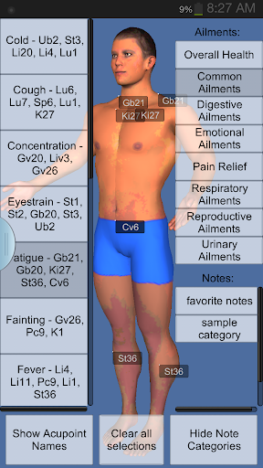 •Built in Ailment categories include Emotional Ailments, Common Ailments, Points for general health, Reproductive and Urinary Ailments, Points for Pain Relief and Respiratory ailments.