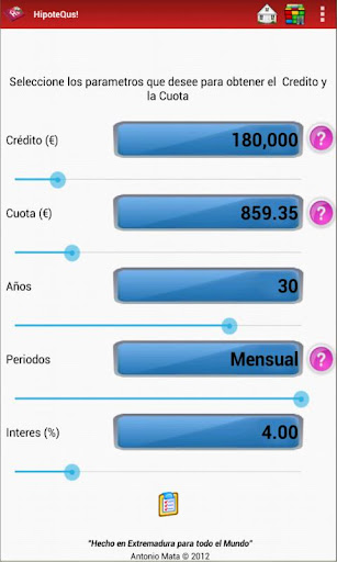 HipoteQus! es una sencilla calculadora de créditos de todo tipo, incluyendo los hipotecarios. Introduzca el importe, el tipo de interes, los años y el numero de periodos anuales en los que quiere pagar su credito e HipoteQus! calculará la cuota periodica que usted debe pagar.