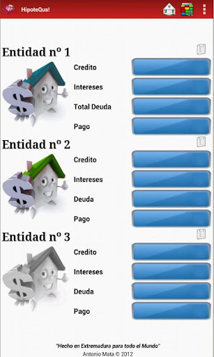 HipoteQus! esta en constantes cambios, introduciendo periódicamente nuevos aspectos y ventajas. Para nosotros es muy importante su opinión. Nos ayuda a mejorar nuestra aplicación. Hemos desarrollado HipoteQus! en los mas habituales terminales con Android, pero siempre se puede escapar alguno ... Si usted detecta que las pantallas no se adaptan a su Android, por favor, informenos a través de la opción de la aplicación para poder modificarla y actualizarla con sus requerimientos de pantalla.