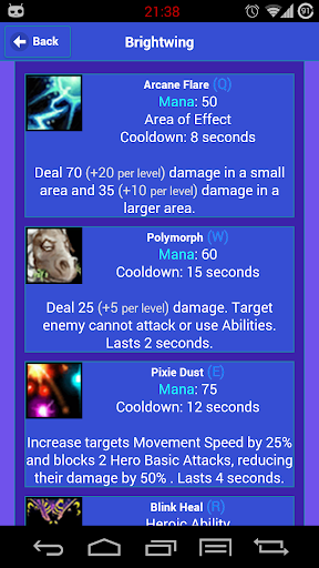 - Stats information, health, regen, mana, damage, range etc and their increase rate per level.
