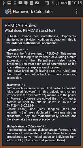 Homework Calculator helps you to solve simple AND complicated math problems. Unlike other calculators, it shows you step by step how to solve the problem and write the solution exactly the way that math teachers expect from you. If you just want to check your results this app is perfect for you.