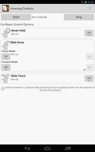 Hovering Controls uses the proximity sensor of your device to register simple motions performed in front of your device. Predetermined apps can be launched by either hovering over the sensor, swiping once, or swiping twice. Silencing an alarm or ringtone is as simple as a hand wave. You can also control your media playback this way, allowing you to change to the next or previous song or video without ever turning on the phone screen and physically touching it.