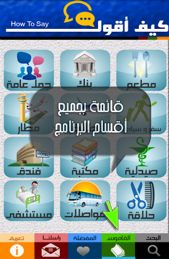 يحتوي هذا البرنامج على قرابة ٣٠٠٠ جملة من الجمل الأشهر و الأكثر استخداما في العالم ويمكنك من خلالها التحدث باحتراف وأنت في: