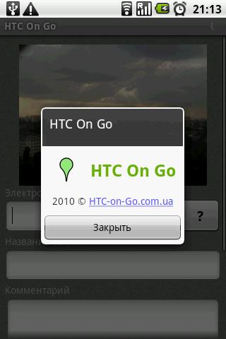 Эта программа — мобильный клиент сервиса HTC-On-Go.com.ua для Android-устройств. Приложение позволяет фотографировать и отмечать интересные точки на карте HTC On Go, с комментариями и рейтингом. Подробнее о сервисе — на странице HTC-On-Go.com.ua.