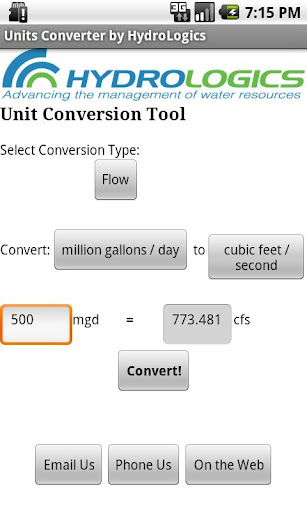 HydroLogics, Inc. presents a free units converter for common water modeling units. Length, Area, Volume, Flow, and even Hydropower estimates.