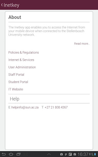 The Inetkey app enables you to access the Internet from your mobile device when connected to the Stellenbosch University network. This app is officially supported and endorsed by Stellenbosch University.