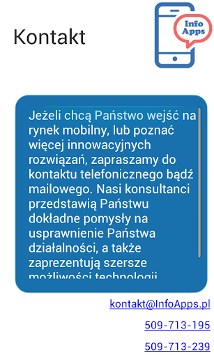 InfoApps jest studiem deweloperskim zajmującym się dostarczaniem rozwiązań mobilnych dla firm i odbiorców prywatnych. Zajmujemy się wytwarzaniem profesjonalnych aplikacji biznesowych, gier oraz aplikacji rozrywkowych. Dużą wagę przywiązujemy również do tak zwanych aplikacji informacyjnych, które przez swoją stosunkowo prostą budowę, mogą być adoptowane nie tylko w rozwiązaniach korporacyjnych.
