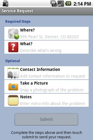 • Employees can additionally provide text comments and/or contact information as optional information to include with each service request, as well as review the current status of previously submitted service requests and view the location of all active service requests for the selected Jurisdiction.