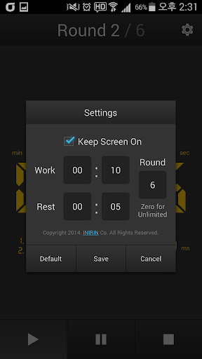Works for tabata, jump rope and any kind of interval training(HIIT). The default time interval is 3 minutes work and 1 minute rest. Customize your own time gap via the setting!