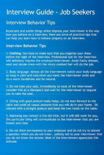 Interview Guide for job seekers is an useful android application for Freshers and Experienced in interview preparation. This Interview Guide for Job seekers App helps you to attend the interview with confidence and ease,