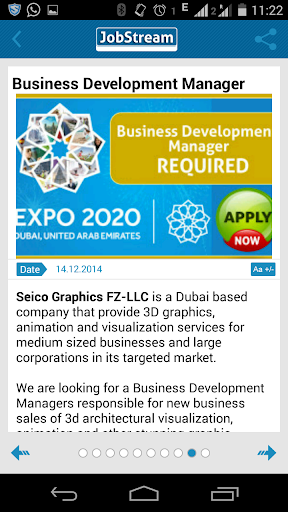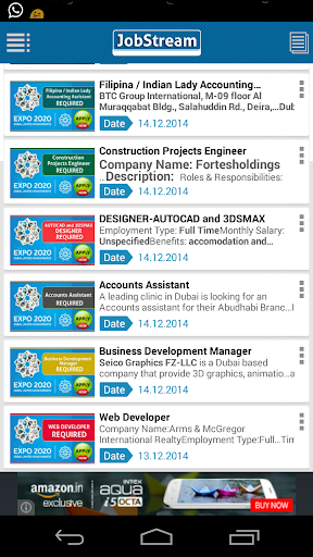 JobStream is a Job Listing Android Application based on Dubai New Job Vacancies. Please like our Facebook Page to get Job alerts instantly. We will not bother users of this Application sending push notifications directly into their Android device or displaying interstitial Advertisements stretching entire screen. To Apply for jobs, use Emails IDs, Phone Numbers or web Links provided with the job description.