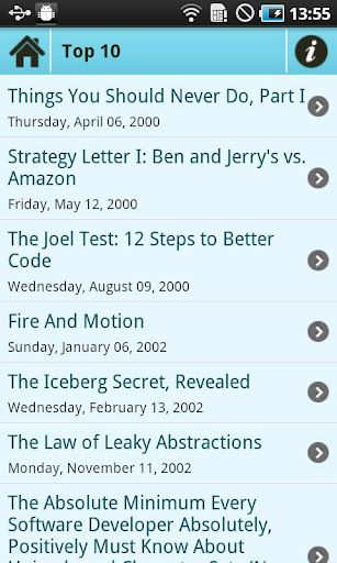 Joel on Software Android App is an attempt to help fellow community members to access these articles on their Android phone, even when they do not have an internet connection. We have created a local archive of most popular articles and have divided them in useful categories to browse through.