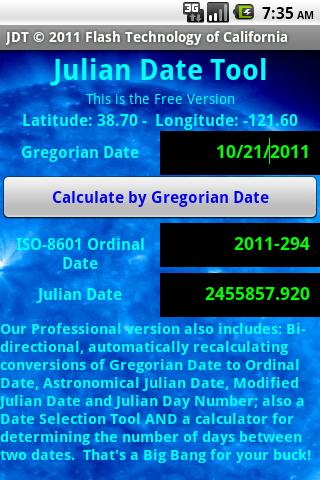 The Julian Date Tool's FreeVersion shows the Gregorian Date and the ISO-8601 Ordinal Date, also known colloquially as the "Julian Date". The actual "Julian Date", used by astronomers is also displayed.