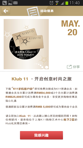 K11特别打造的“手机会员卡”,是基于K11优质服务的创新应用。集手机会员卡、导购指南、无线预约、艺术品导览、活动介绍等功能于一身,为顾客带来全新的购物体验。