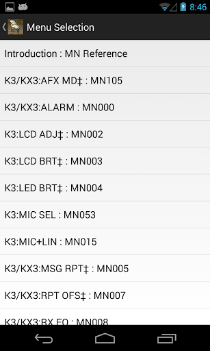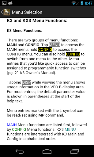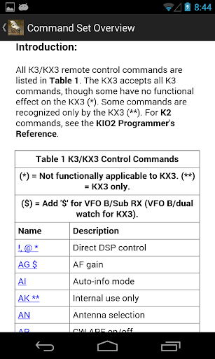 K3/KX3 Programmer's Reference is intended to be a handy reference to the Elecraft K3 & KX3 Programmer's Reference document in an easy to use Android phone format.