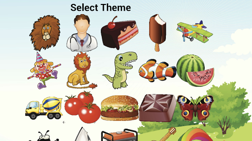 Image collection of different categories like Animal, Animal Face, People profession, Pastry, Ice cream, Aeroplane, Circus, Dinosaurs, Aqua-Fish, Fruits, Vegetables, Food, Vehicles, Chocolates, Pastry, Home appliances, Tools/Instruments, Music Instruments, Hats/Caps and Random Shapes