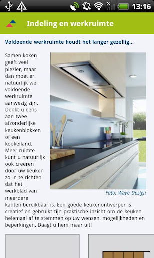 De Keukens-app bevat diverse artikelen en productinformatie over allerhande aspecten van koken en keukengenot. Daarnaast kunt u met de Woonwinkels-functie snel alle woonwinkels bij u in de buurt vinden die keukens verkopen, of zoeken op plaatsnaam of postcode. Van de gevonden woonwinkels kunt u adresgegevens en openingstijden weergeven. Daarnaast kunt u direct bellen of mailen, of de locatie van de winkel openen in de ingebouwde Kaarten-applicatie om de kortste route te vinden.