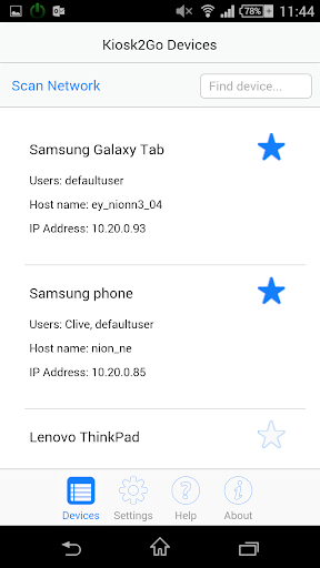 This application scans the network for MediaMatrix nodes running Kiosk2Go, and presents a list of all the Kiosk2Go devices. You can tap a device to connect to Kiosk2Go full screen or in the default browser. If no browser has been set as the default, you will be presented with a list of available browsers to use.
