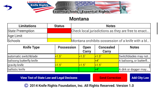 The Knife Rights LegalBlade™ App IS FOR INFORMATIONAL PURPOSES ONLY and DOES NOT PROVIDE LEGAL ADVICE. You must not rely on the information provided by the LegalBlade™ App as an alternative to legal advice from a competent attorney.
