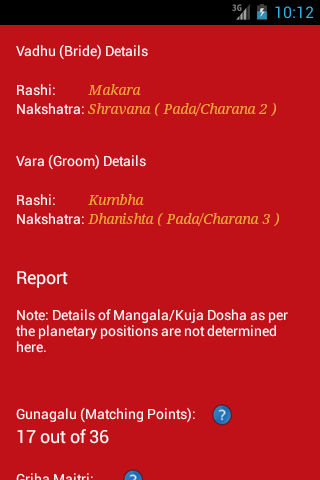 4. Calculates and displays important parameters like Guna, Griha Maitri (compatibility) , Dosha's, etc.