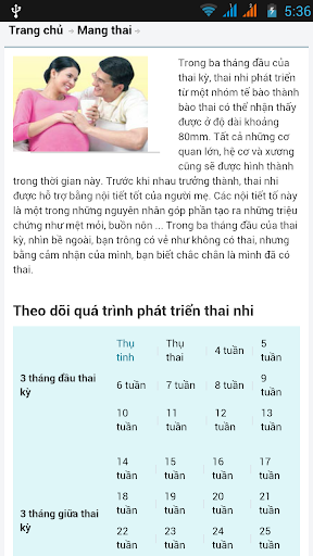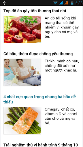 - Các thông tin dành cho bà bầu: các giai đoạn phát triển thai nhi, thông tin dinh dưỡng - món ăn cho bà bầu, chăm sóc sức khoẻ bà bầu